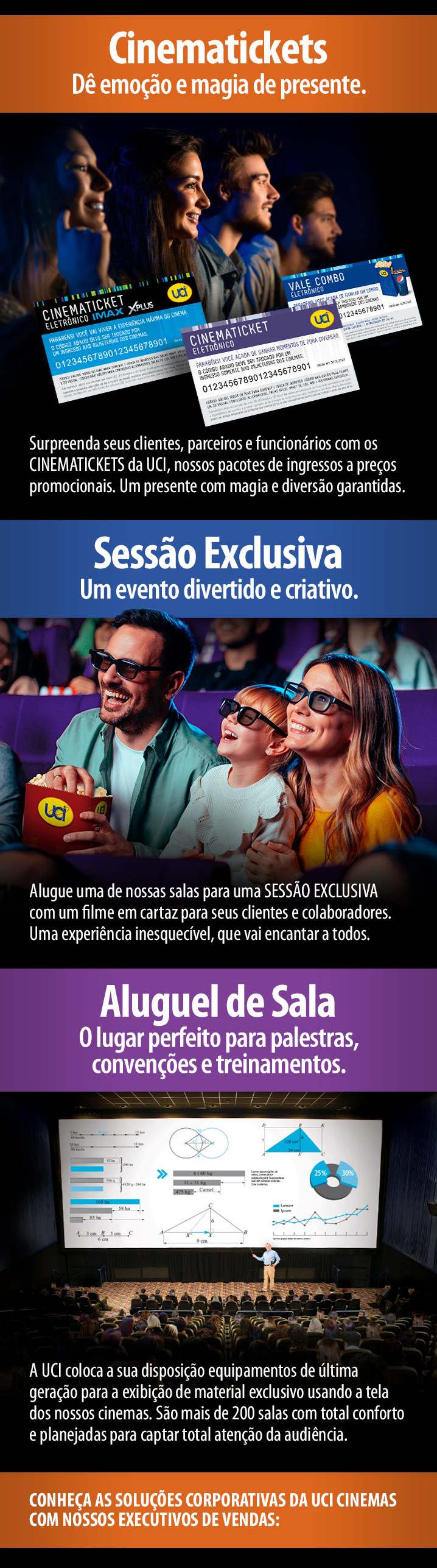 Os cinemas UCI recebem diversos formatos de evento, como: Sessões de cinema exclusivas para funcionários ou clientes; Palestras e treinamentos com uso de microfone e projeção; Lançamentos de produtos ou campanhas publicitárias; e Ações promocionais com entrega de brindes ou personalizações.